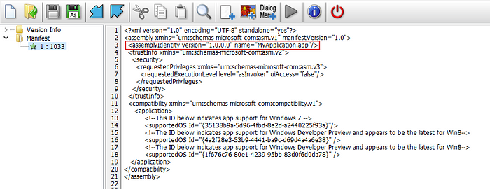 - The <assemblyIdentity> field within the embedded application manifest must not exist, or the entire embedded application manifest must not exist (more on this in a bit)