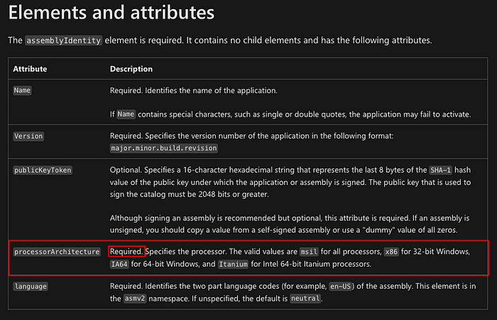 These two values are checked against each other to validate assembly identities are the same. If the default identity value is present in the assembly’s embedded manifest it will fail because there is no ‘processorArchitecture’ value present. Therefore, this type of assembly is not possible to use as a ClickOnce application for our purposes. Modifying this value would require modifying the host assembly of our code execution, losing any benefit of a valid code-signature or reputations with Microsoft SmartScreen.