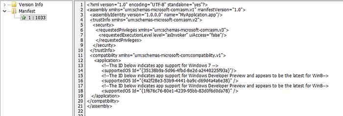 Fortunately there are a lot of assemblies that exist which do not have an identity in the application’s manifest. In the next section we will show how to identify these assemblies, but in the meantime, the figure below shows what an embedded manifest looks like when the default identity is not set, and a non-default manifest was used during the build process instead.