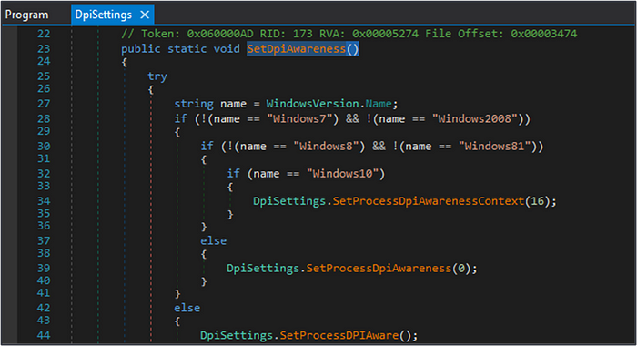 Using DnSpy to begin at the target .NET assembly’s entry point, we follow the code to the first method call of “SetDpiAwareness()”. This function exists within on the the Dlls previously identified: